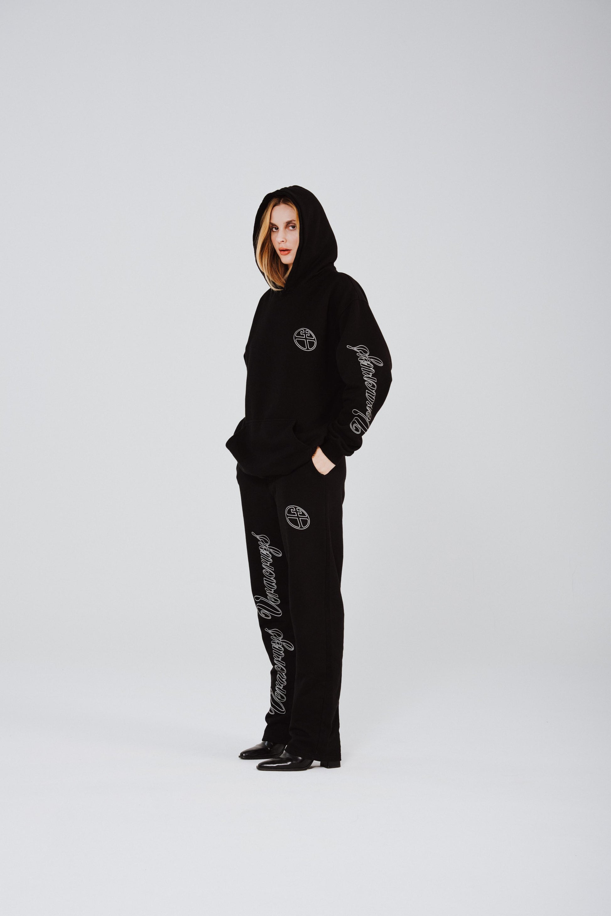 Hoodie Negro oversized, confeccionada en tejido 100% algodón pesado (320g), estampado en color blanco de alta densidad centrado en el frente, espalda, capucha y manga izquierda.