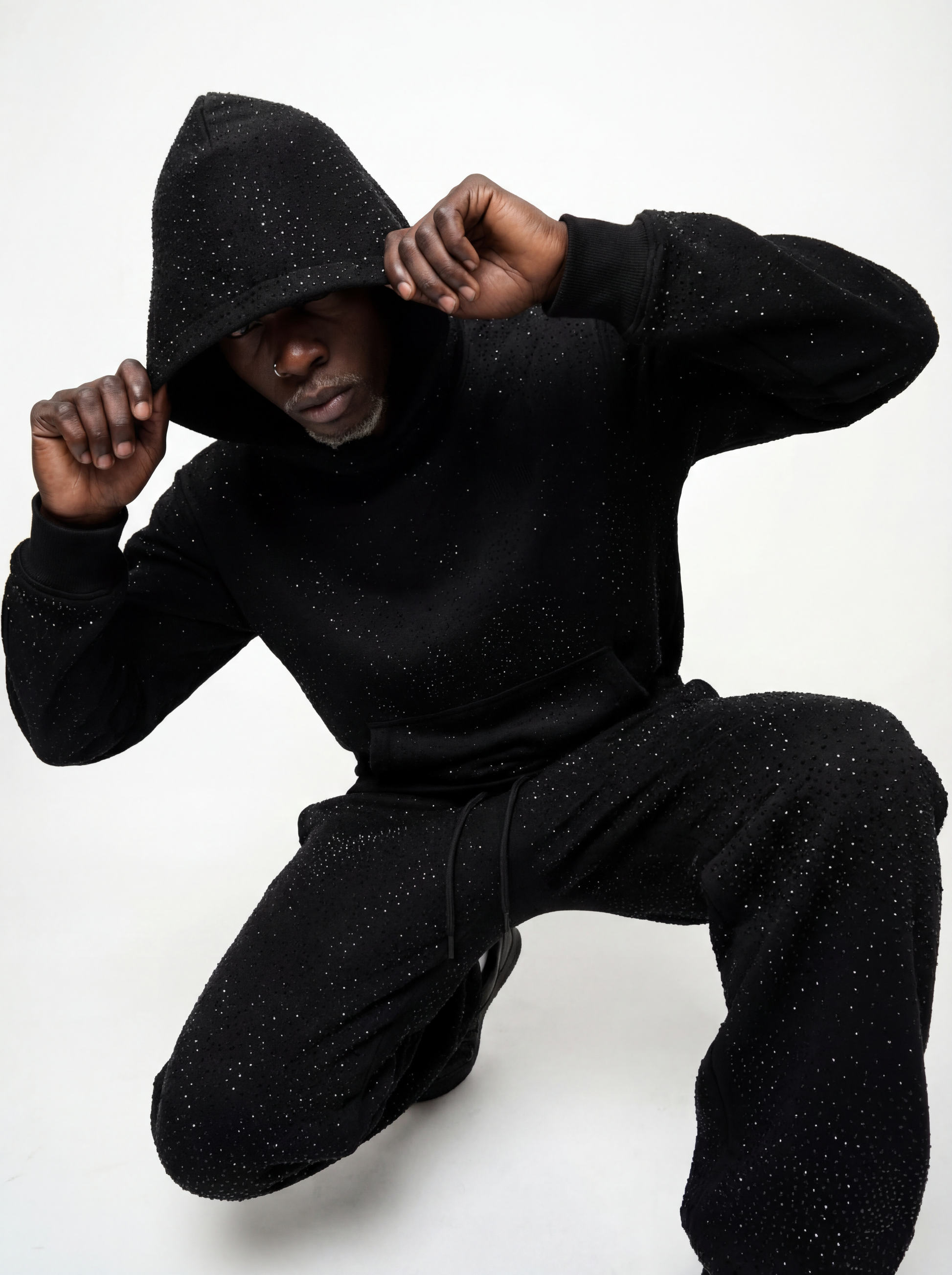 Hoodie Negro oversized, confeccionada en tejido 100% algodón pesado (320g), estampado en color blanco de alta densidad centrado en el frente, espalda, capucha y manga izquierda.